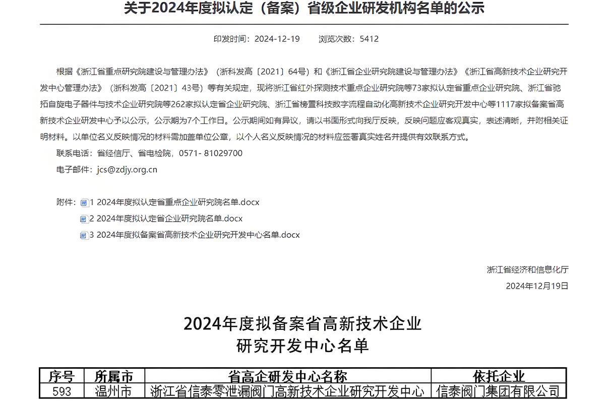 近日,《浙江省重点研究院建设与管理办法》《浙江省高新技术企业研究开发中心管理办法》等相关规定,浙江省科技厅近日公布了2024年度拟认定的省级企业研发机构名单,信泰阀门集团有限公司成功入选浙江省高新技术企业研究开发中心。